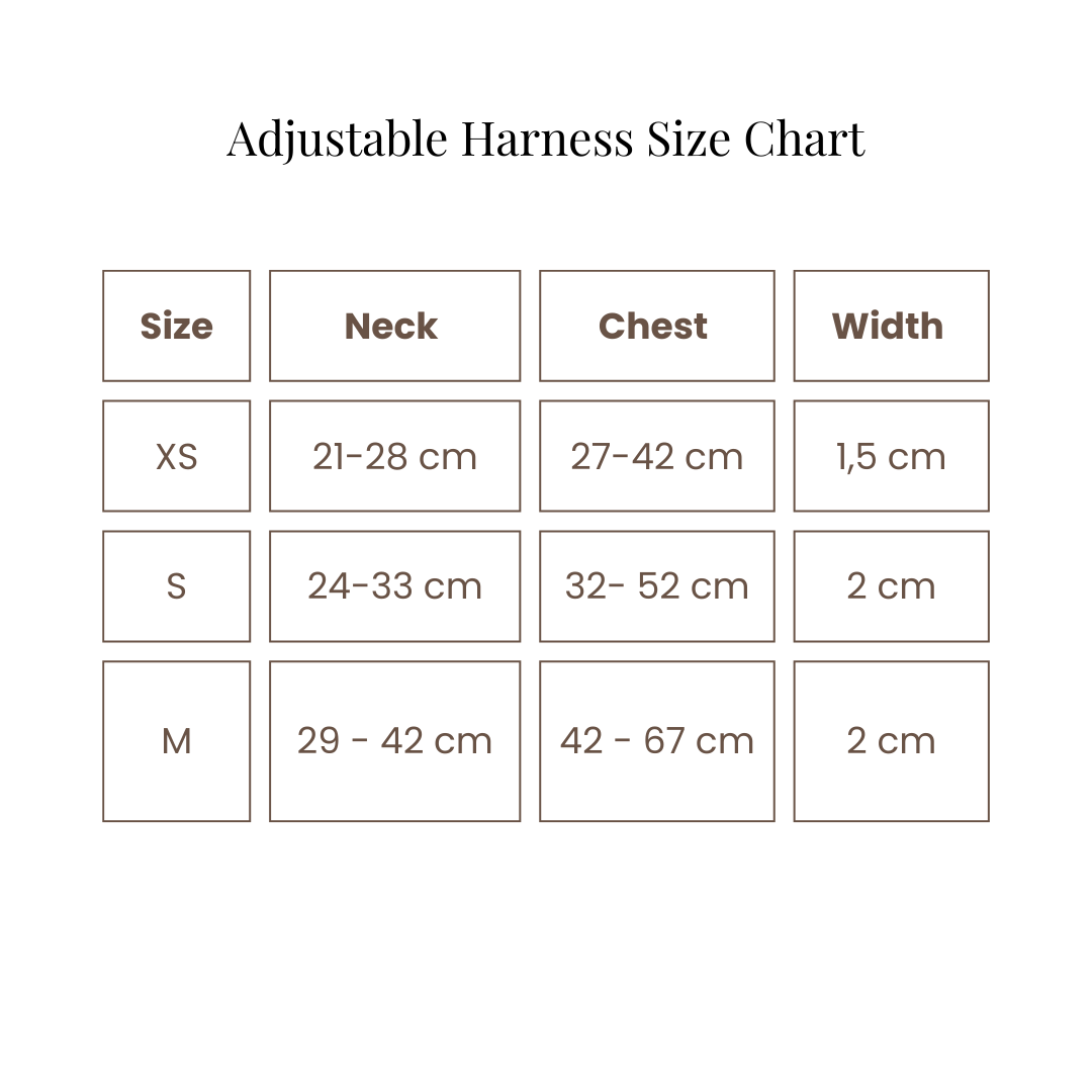 Nämä ovat minimi- ja maksimimitat, joihin valjaat säätyvät. Koirasi mittojen tulisi olla näiden mittojen välillä sekä kaulan että rinnan osalta. Tarkista koko-oppaamme ja mittaa koirasi kaulan ja rinnan ympärys huolellisesti ennen tilaamista. Jos tarvitset apua tai olet epävarma koosta, lähetä meille sähköpostia osoitteeseen hello@minlamilan.com , niin autamme mielellämme!