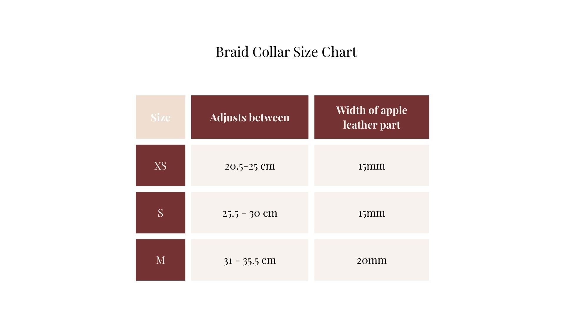 Due to the handmade nature of these products, please allow for small variance on sizing (up to 1cm).Moon (grey) tends to be slightly bigger than petal (pink). If your dog is right at the end of a size, in between the sizes or you are just little unsure, please email us at hello@minlamilan.com with your dog’s measures so we can make sure you will get the right size collar.